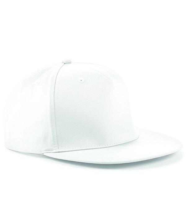 100% Cotton twill, 5 panel., Stitched ventilation eyelets., Flat peak., Retro style snapback size adjuster., Tear out label.