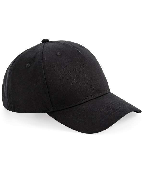 5 panel, Stitched ventilation eyelets, Self fabric strap with tri-glide buckle, Structured front panels, Pre-curved peak, Tear out label, 100% organic cotton twill