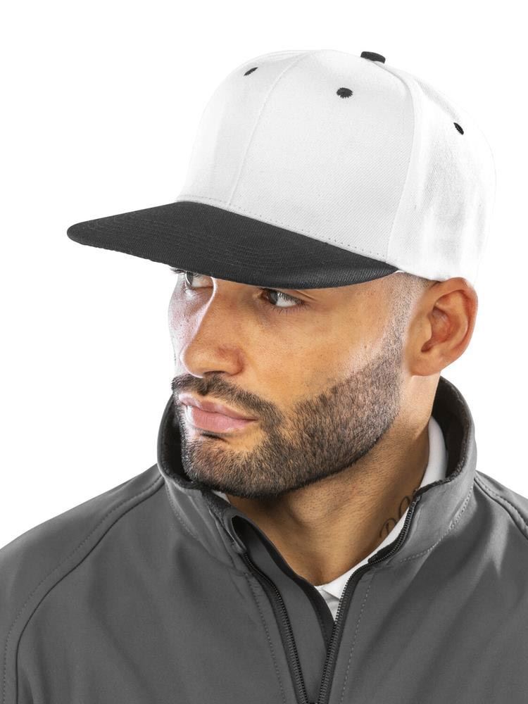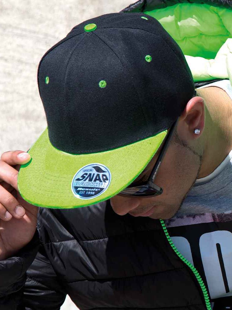 6 panel,Stiffened front panels,Flat peak with 6 stitch lines,Contrast colour peak, stitch eyelets and button,Snapback adjuster