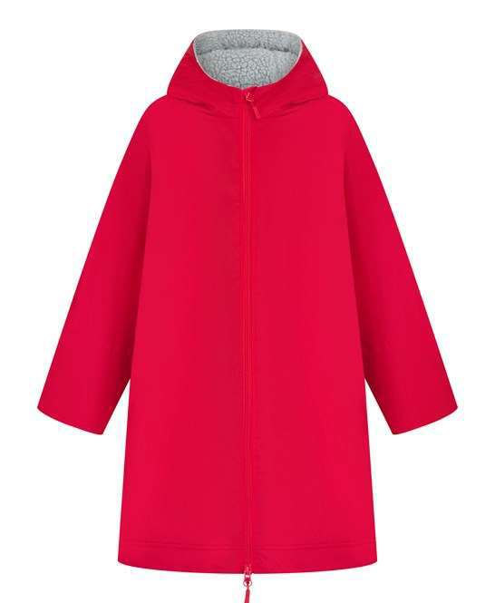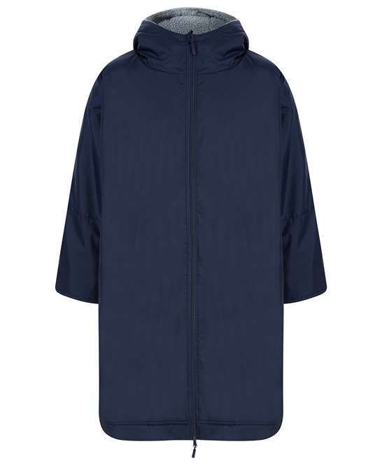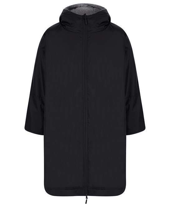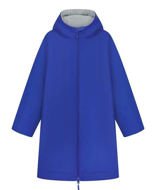 The ultimate team robe is made in a water resistant fabric with a cosy sherpa fleece lining and three-piece hood. The roomy fit with double-ended full front zip allows wearers to keep warm and get changed underneath the robe. Perfect for wild swimming or wearing on team sidelines. Zipped pockets with fleece lining keep hands warm with multiple inner pockets for keeping belongings safe. Topped off with a large embroidery zip for access to directly decorate., Also available in adults sizes LV690, Outer 130 gsm, Lining 280 gsm
