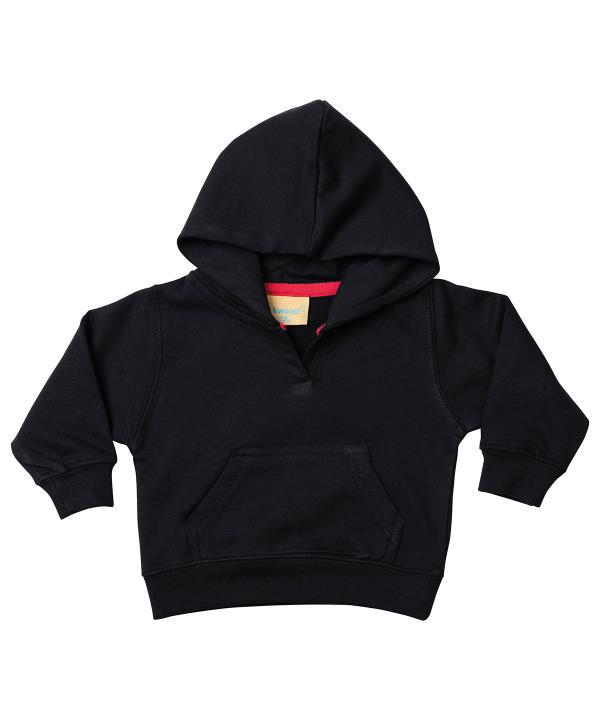 Contrast taping inside neck seam, Single jersey lining in hood, Kangaroo pocket, Twin needle stitching, Knitted rib at cuff and hem, Hooded sweatshirt with placket detail at front neck
