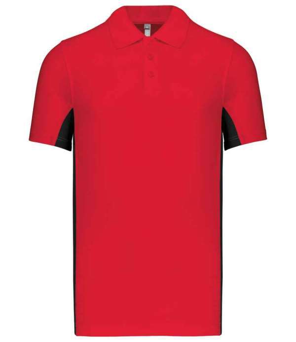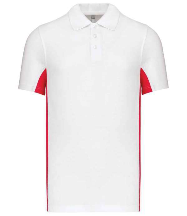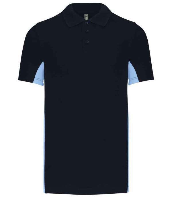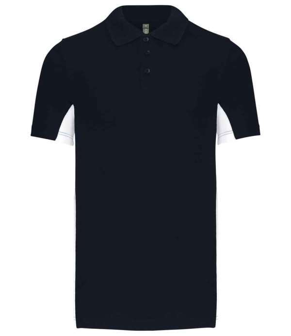 Flat knit ribbed collar, Three self colour button placket, Side vents, Taped neck, Contrast panels on underarms and sides, Twin needle stitching