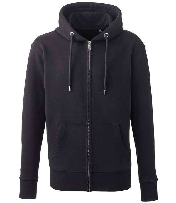 Soft cotton faced fabric., Drop shoulder style., Brushed back fleece., Double fabric hood with self colour drawcord., Nickel free eyelets and drawcord tips., 2x1 ribbed cuffs and hem., Full length metal zip., Twin needle stitching., Front pouch pockets., Unbranded size label at neckline., Garment measurements have a tolerance of +/- 2cm