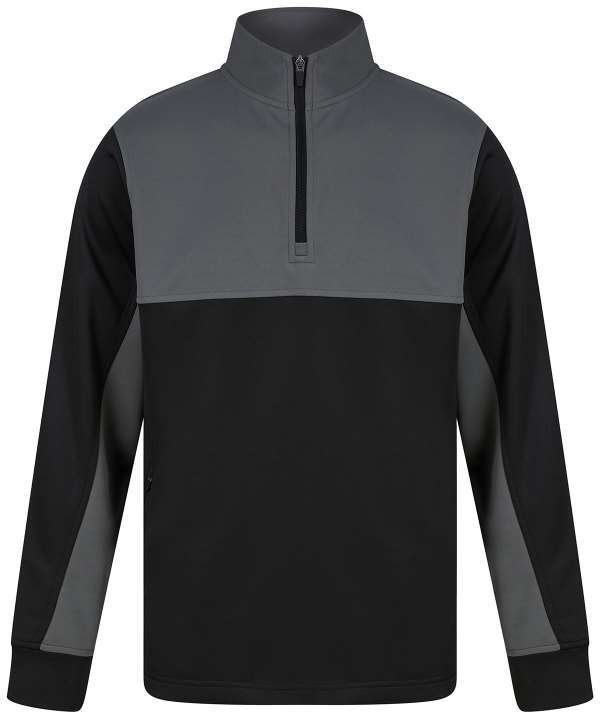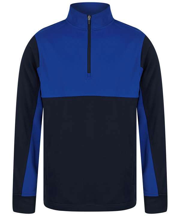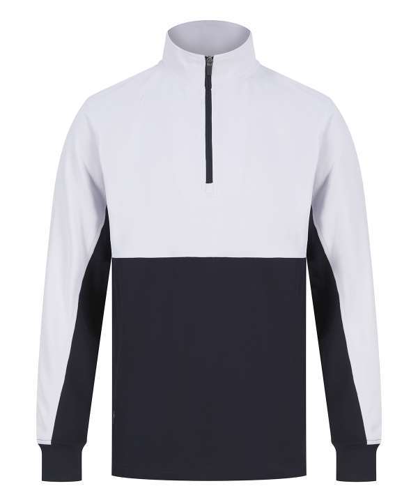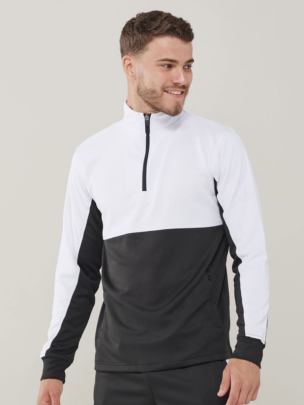 Contrast nylon zip., Two front zip pockets., Tear out label., Contrast upper chest and underarm panels.