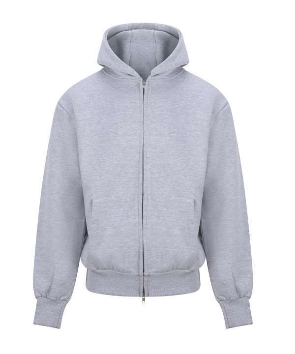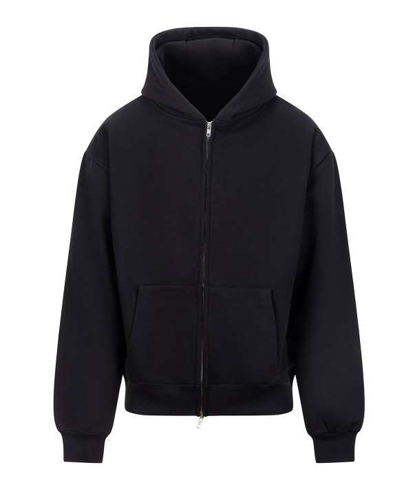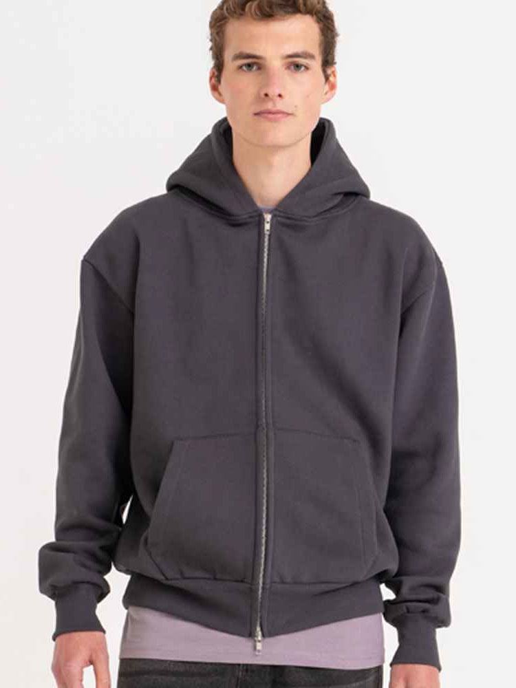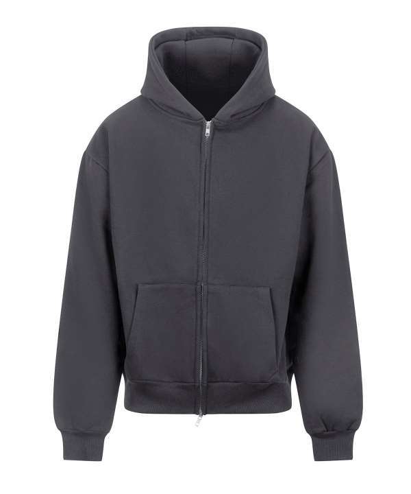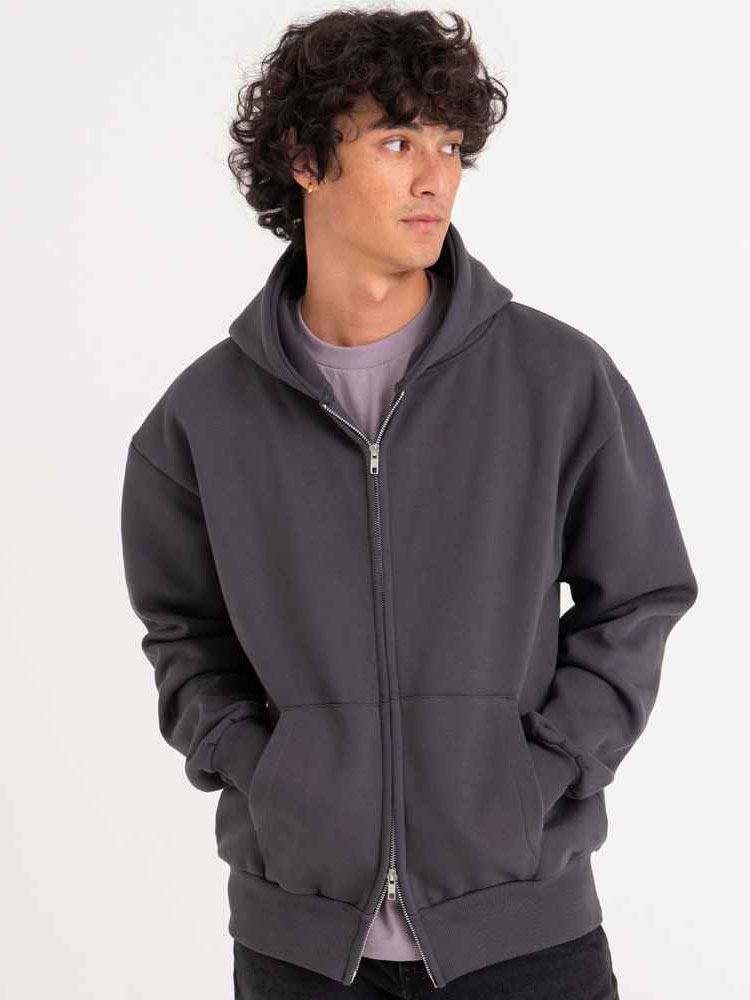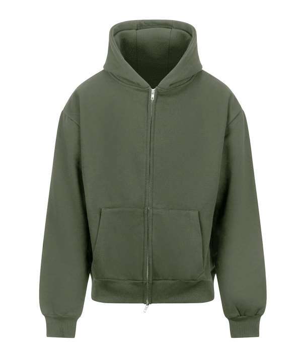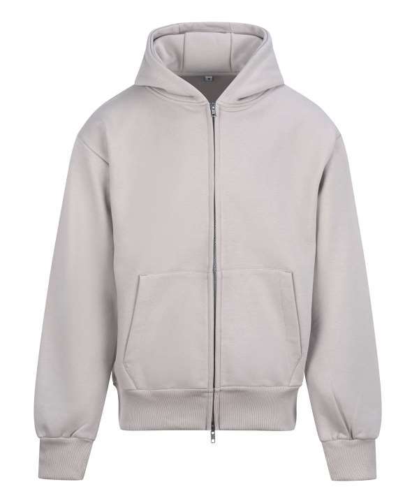 Cotton faced fabric., Drop shoulder style., Three panel double fabric hood., Front pouch pockets., Twin needle stitching., Brushed back fleece., Oversized fit., Full length two way zip., Ribbed cuffs and hem., Tear out label.