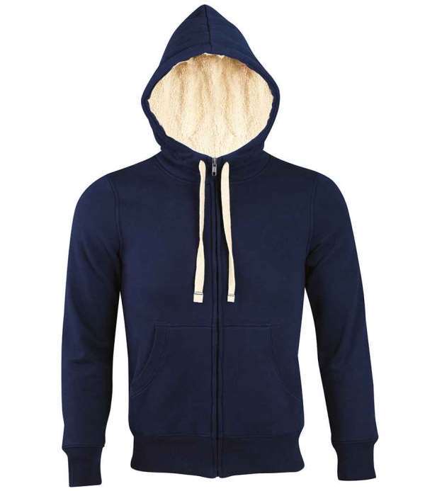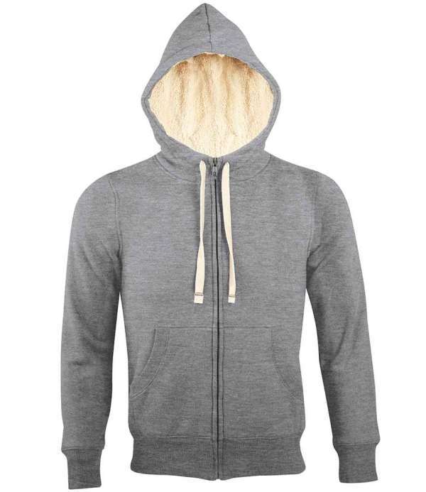 100% polyester cream sherpa lined body and hood., Cream drawcord., Drop shoulder style., Front pouch pockets., Deep ribbed cuffs and hem., Tag free., 80% cotton/20% polyester., 280 gsm