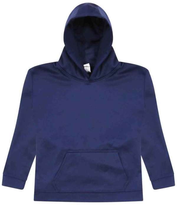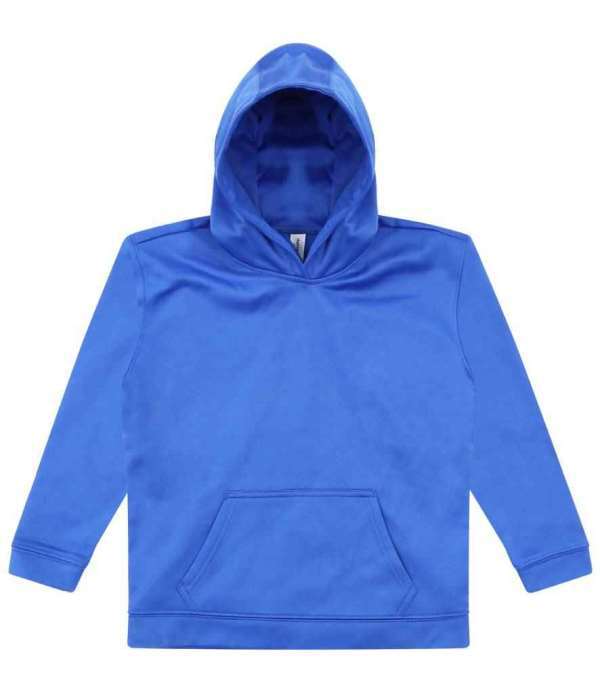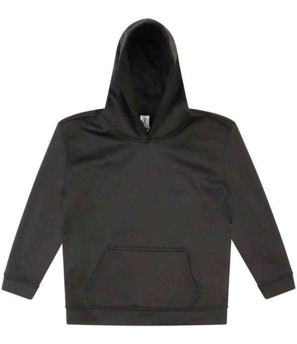 Brushed back fleece., Sporty fit., Drop shoulder style., No drawcords to comply with EU regulations., Front pouch pocket., Tear out label., Three panel double fabric hood.