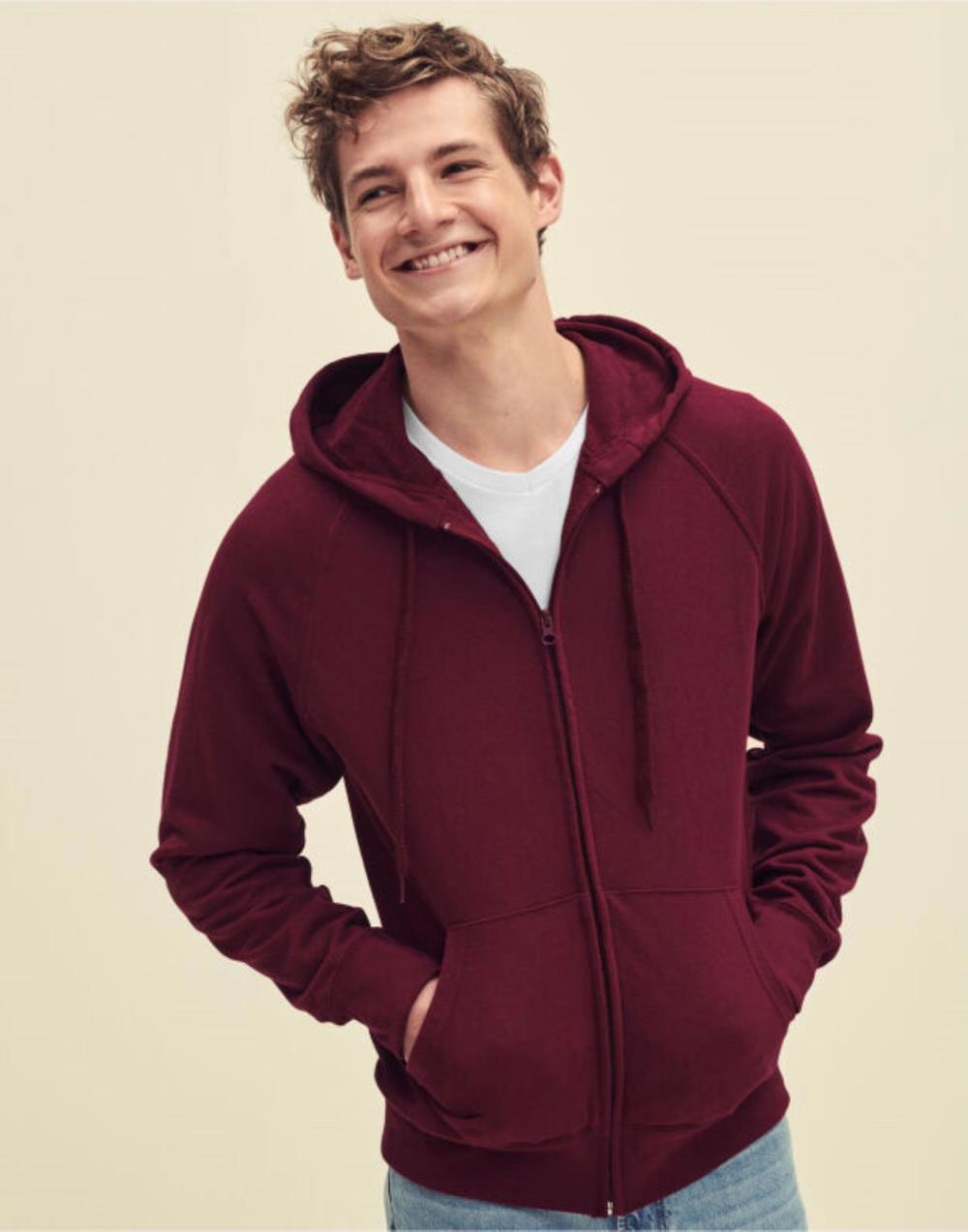 Lightweight unbrushed fleece,Raglan sleeves,Hood with self coloured flat draw cord,Covered zip for enhanced printability,Two front pouch pockets