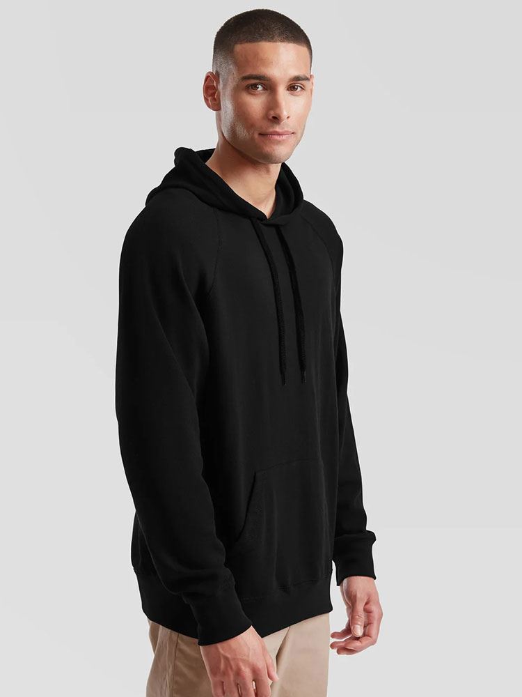 Lightweight unbrushed fleece,Raglan sleeves,Hood with self-coloured flat draw cord,Front pouch pocket,Waist and cuff in cotton/Lycra(R) rib