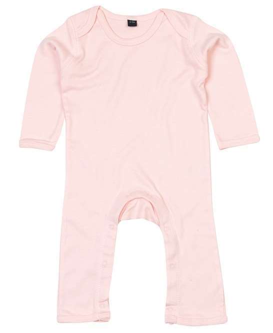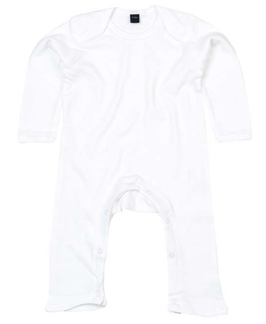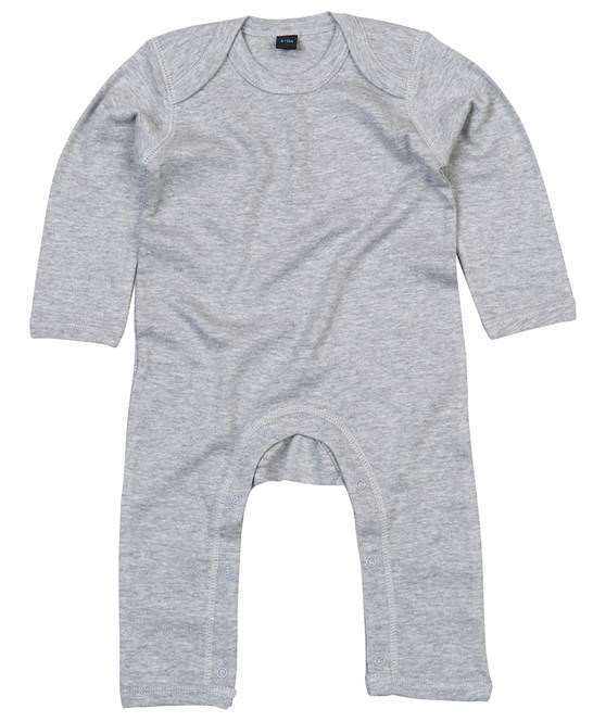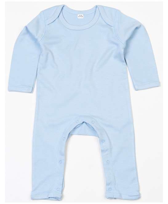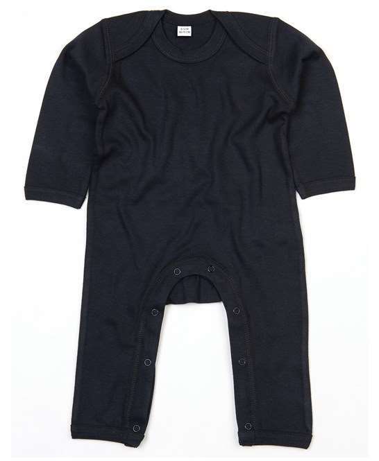 100% organic cotton, Envelope neckline., Self fabric bound cuffs and leg openings. Self colour popper closure around legs.
