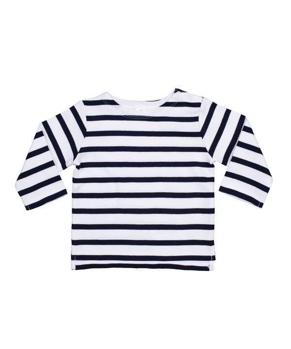 Nickel free navy shoulder poppers, Side vents, Drop tail, Yarn dyed stripes, Soft stretch fabric, Tear-away label