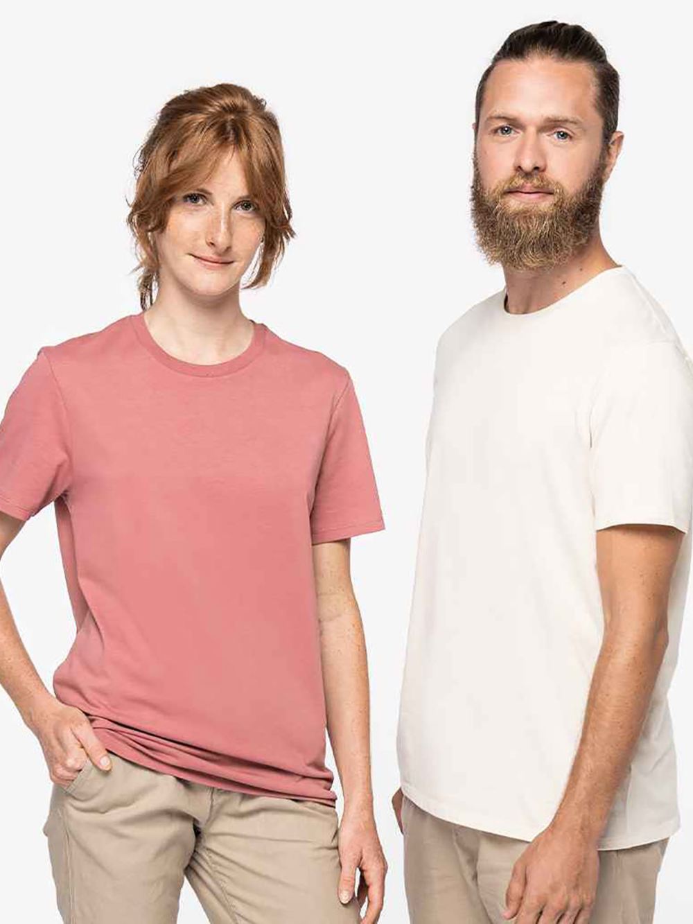 Certified by Global Organic Textile Standard (GOTS)., Enzyme washed, Slim fit, Reinforced shoulder seams, Side seams., Twin needle sleeves and hem, Tag free, 100% organic combed cotton