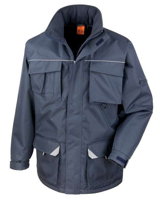 Full front heavy duty zip. Fully taped seams. Tear release storm flap. Concealed hood with adjustable drawcord. Deep front patch pockets, with soft feel microfleece hand warmer packet access. Semi detachable left chest pocket with tear release/stud and zi