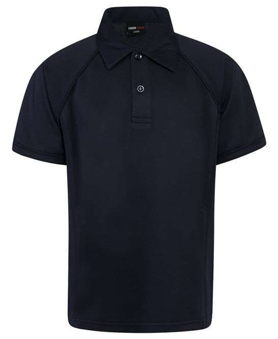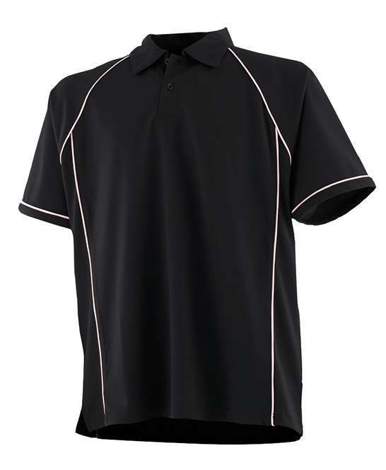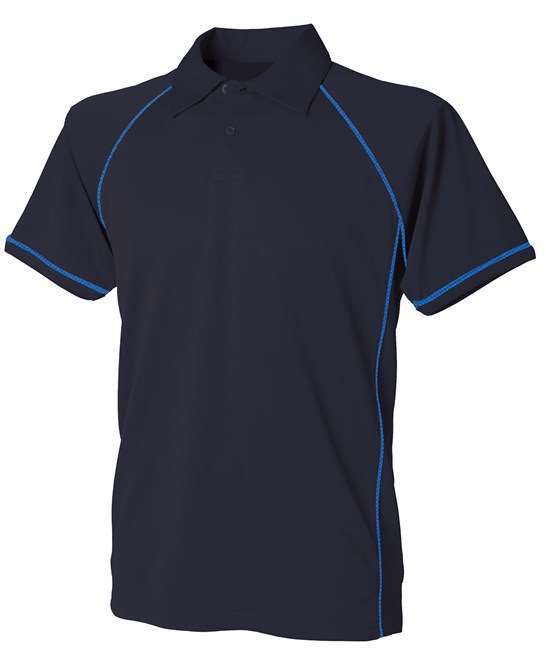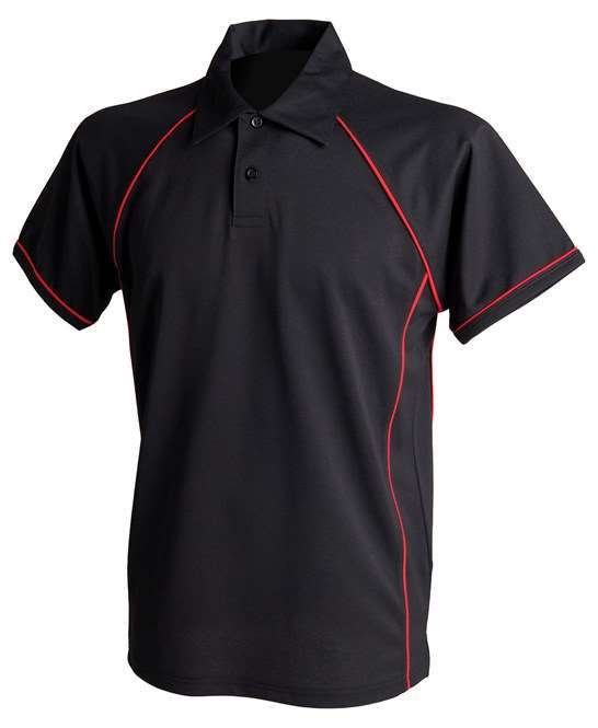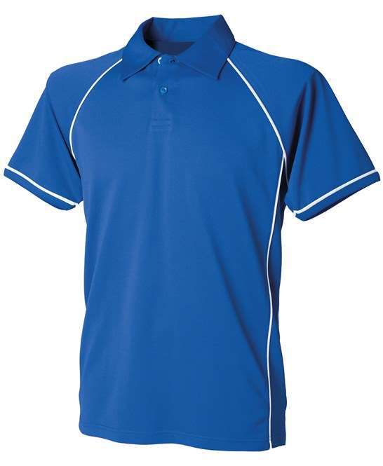 Coolplus specially modified polyester fibres enable rapid absorption of sweat from skin surface,Raglan sleeves,Shaped side seams.,Contrast white piping along raglan seams and down front & back,2-button placket