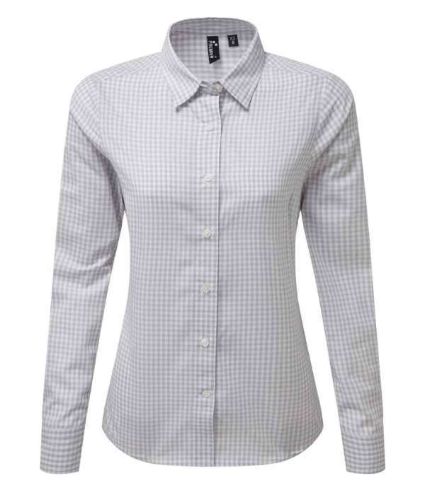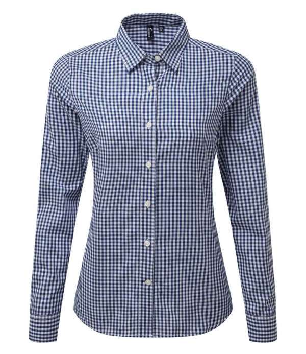 Gingham check., Modern fit., Bust and back darts., Curved hem., Single button cuffs.