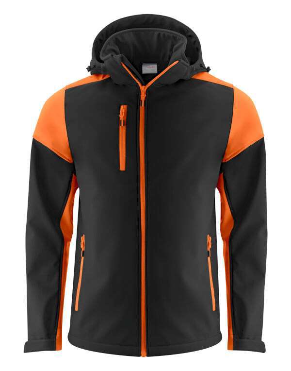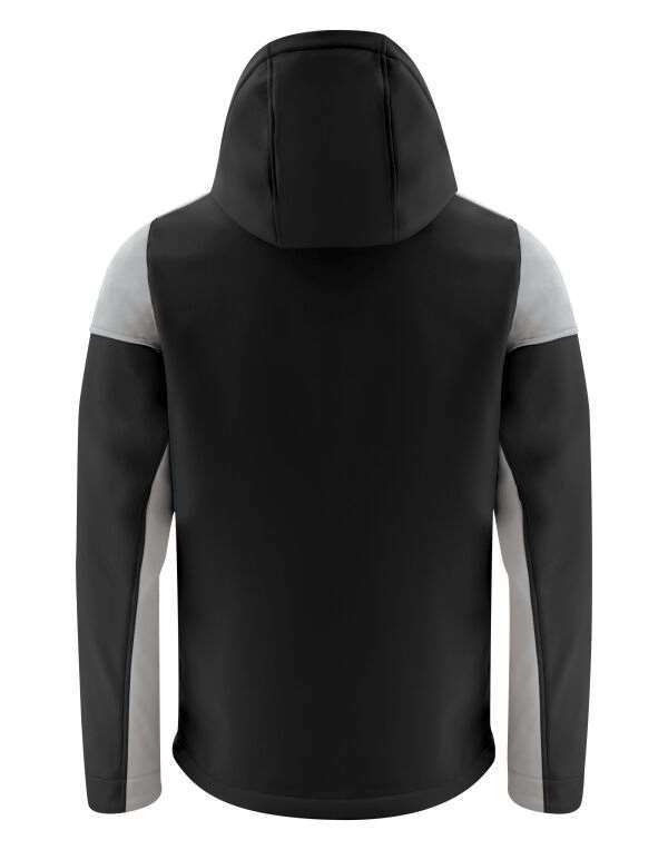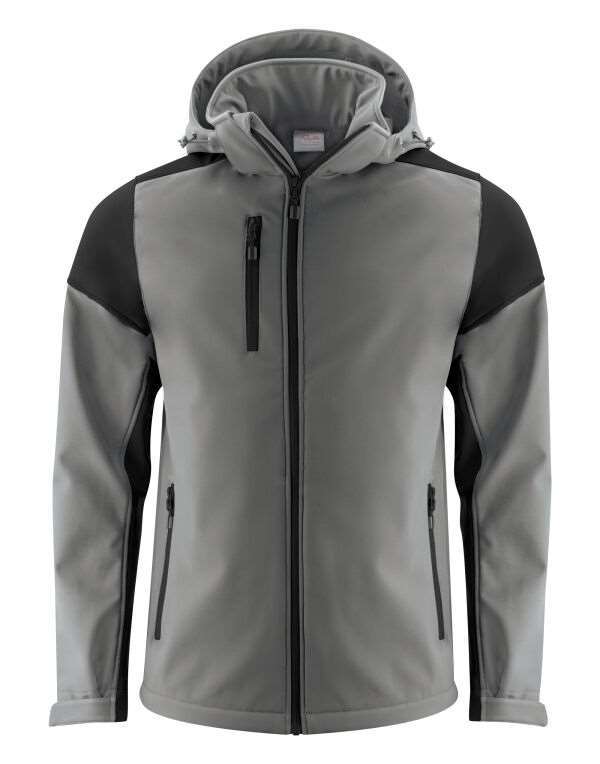 100% Recycled Polyester bonded with 100% Recycled Polyester Fleece, Bicolour softshell jacket with detachable hood, Contrast zipper in centre front and on front pockets, Adjustable Velcro-straps at bottom sleeves and elastic cord at the hood and bottom seam., Tear-out neck label and separate woven size label, Waterproof 3000 / Moisture Vapour Permeability 3000 - tested according to ISO811:2018 and ASTM E96/96M, Oeko-Tex SH020 121271 TESTEX