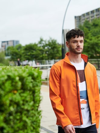 Warm backed polyester soft shell outer, Contrast full length zip with chin guard and inner zip guard., Vibrant purple/black has white zip, Wind resistant membrane., Showerproof.