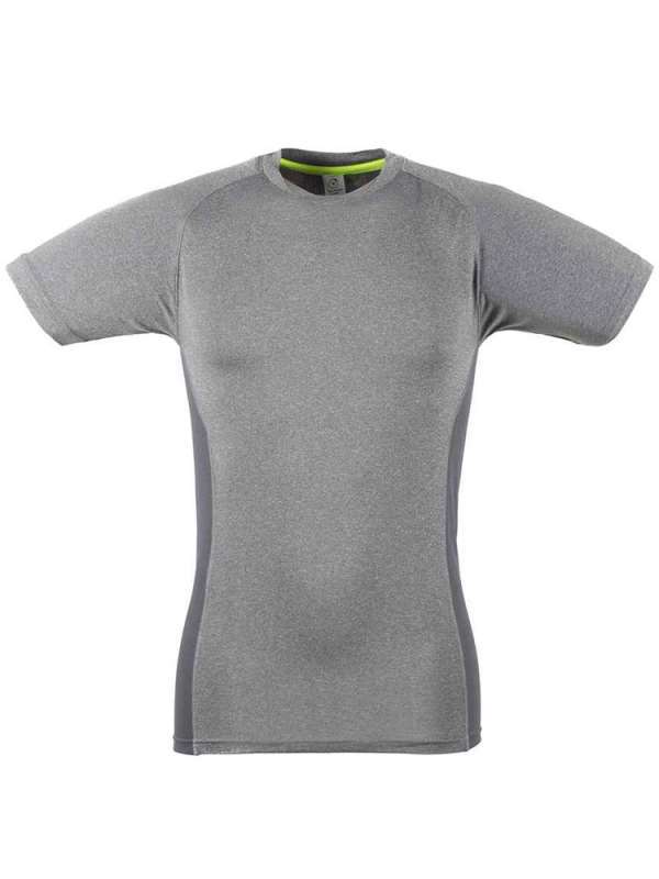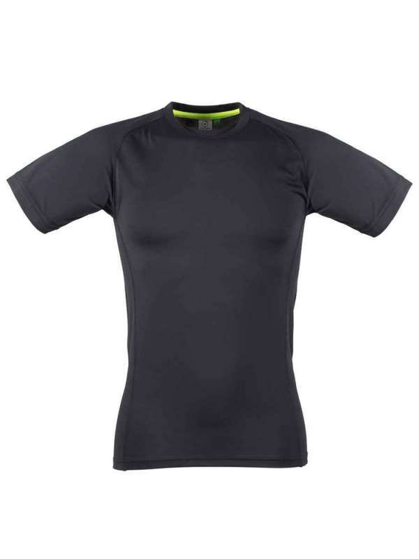 Slim fit., Raglan sleeves., Flatlock stitching., Tear out label., Self fabric neckline., Mesh side panels and back yoke., Twin needle sleeves and hem.
