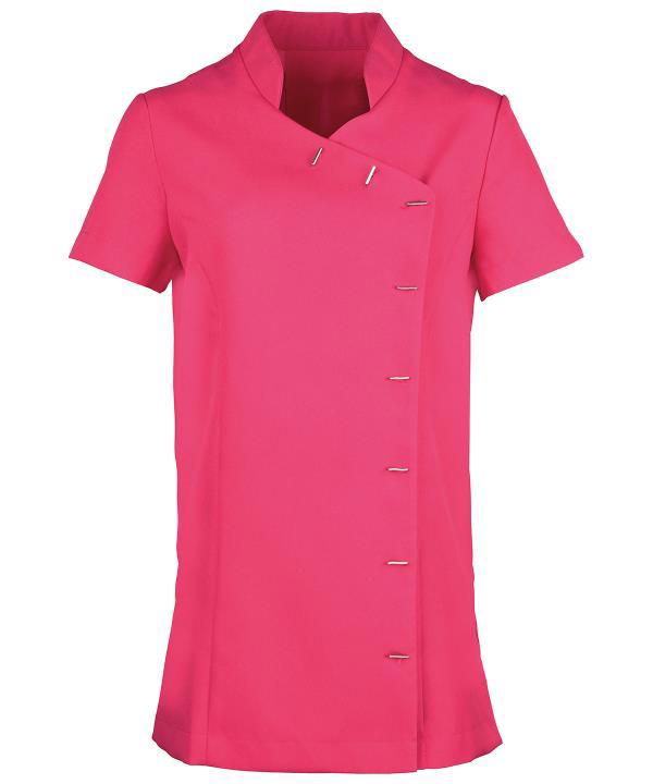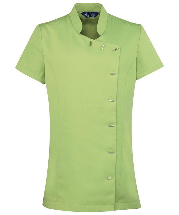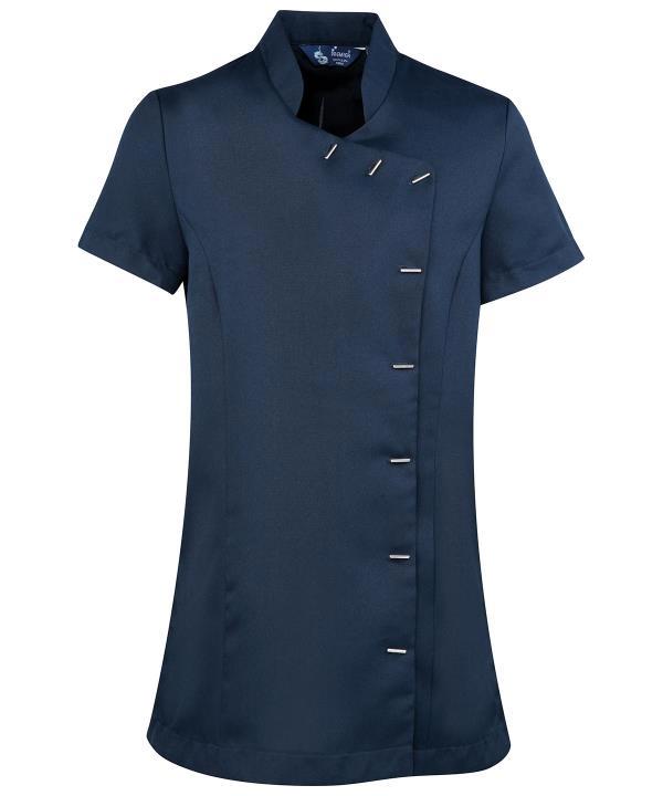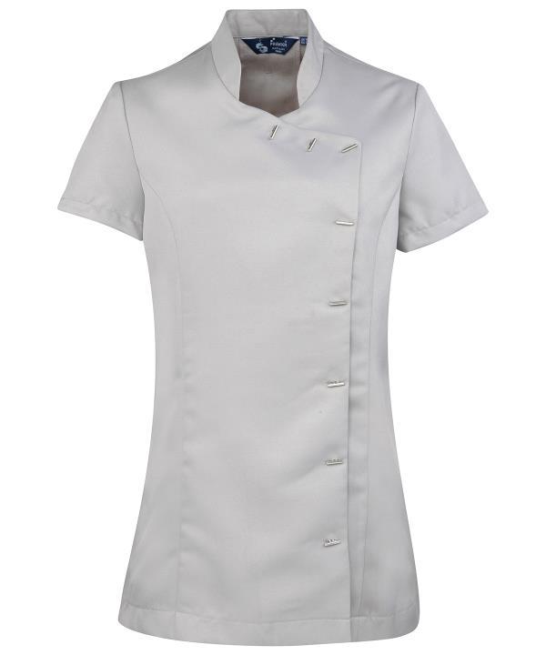 Mandarin collar, Flattering feminine fit with bust and back darts, Eight bar button fastening, Back pleat for ease of movement, Princess seams