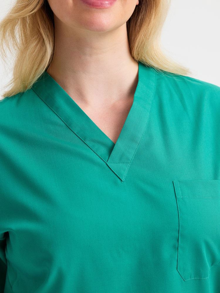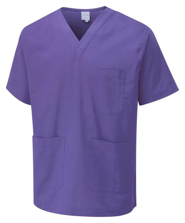 65% Polyester 35% Cotton, V Neck Line, Patch Pocket on left chest, Two Patch Pockets on Lower Front, Regular Fit, Suitable to wear as a uniform with UC922 Scrubs Trouser